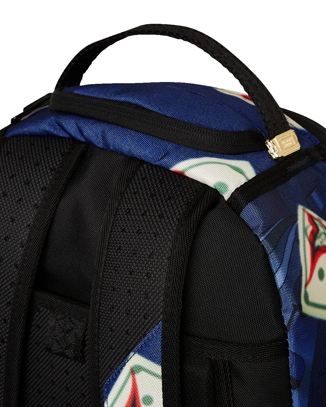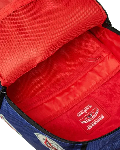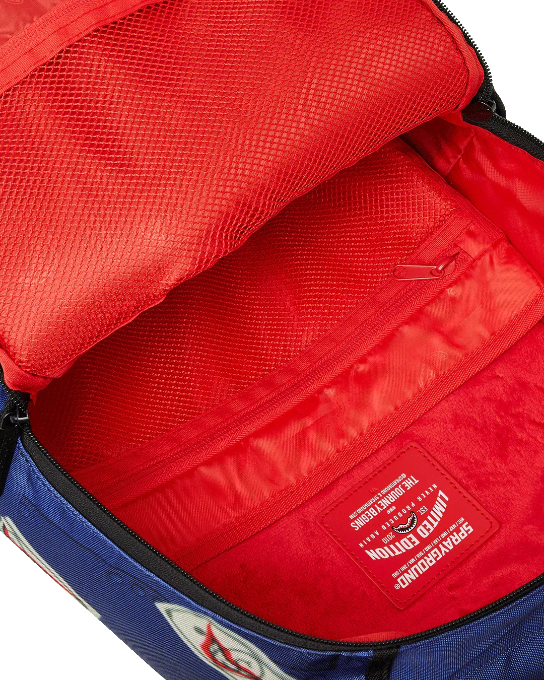 Dimensions: 18" x 6" x 11.5" • Front zipper pocket • Side pockets • Zippered Stash pocket • Separate velour sunglass compartment • Ergonomic mesh back padding • Adjustable Straps for custom sizing • Gold zippers with metal hardware • Metal "Sprayground Authentic" badge • Slide through back sleeve connects to carry-on luggage to free your hands